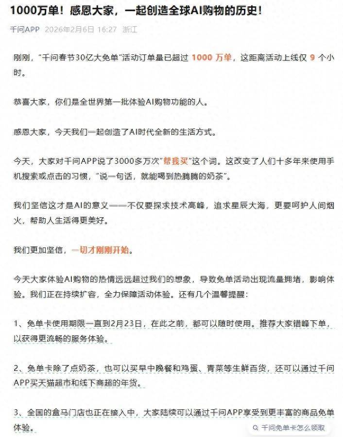 2月6日,据千问官方,“千问春节30亿大免单”活动订单量已超过1000万单,这距离活动上线仅9个小时。